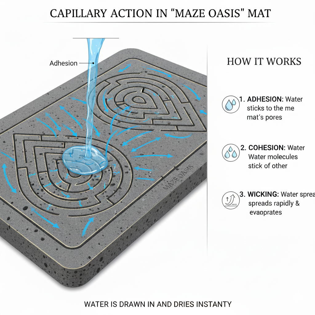 In a "Maze Oasis" bath mat, which is likely made from a porous material like diatomaceous earth (DE), capillary action is the primary mechanism for its rapid drying properties.