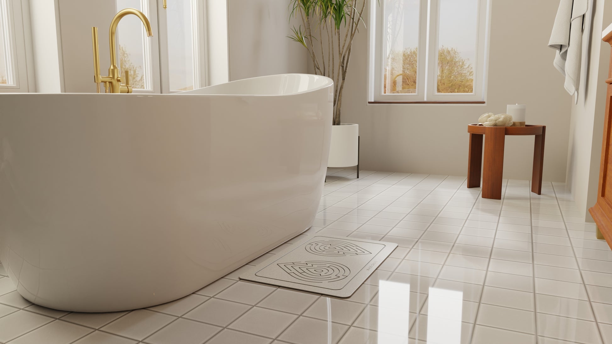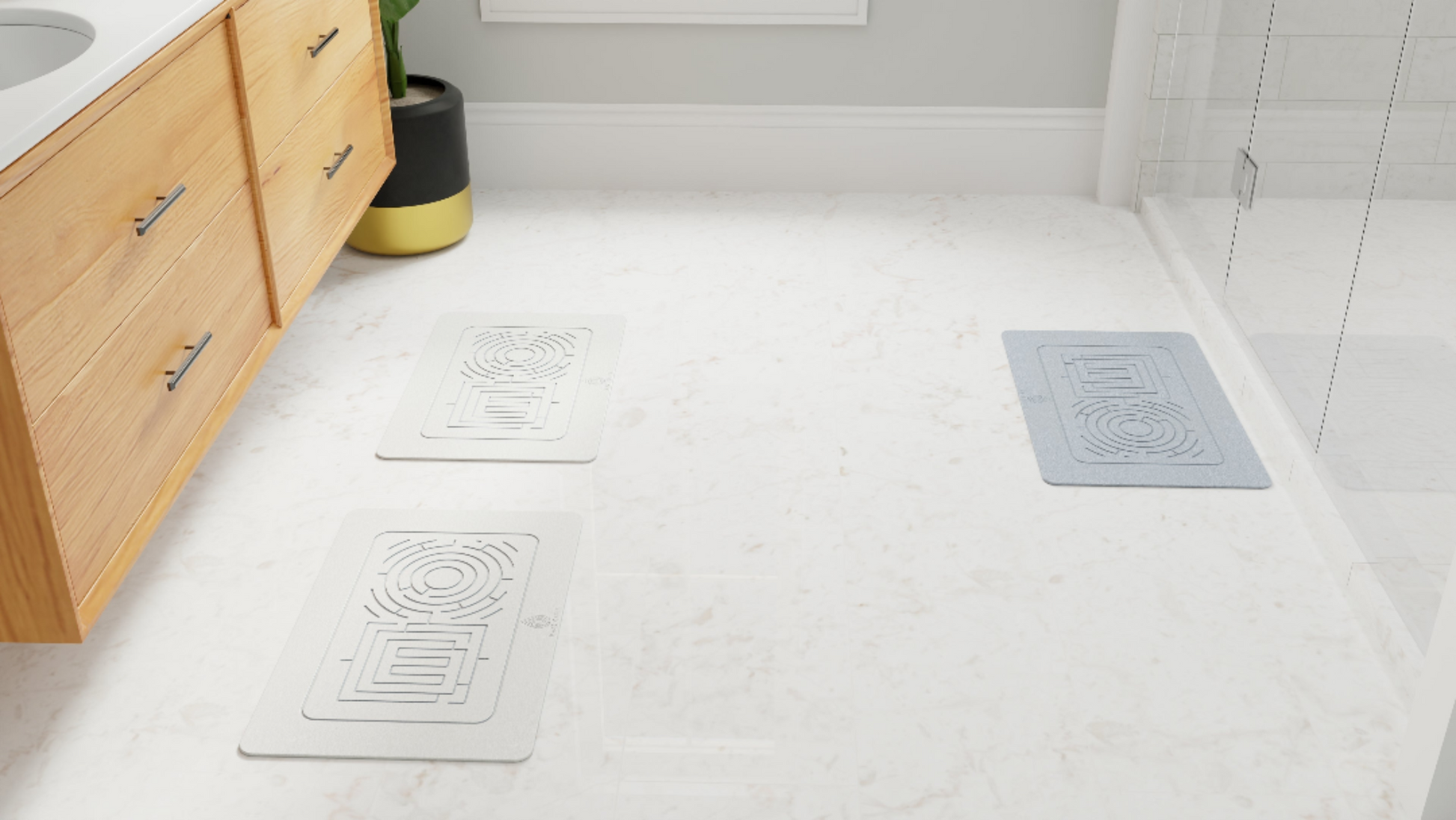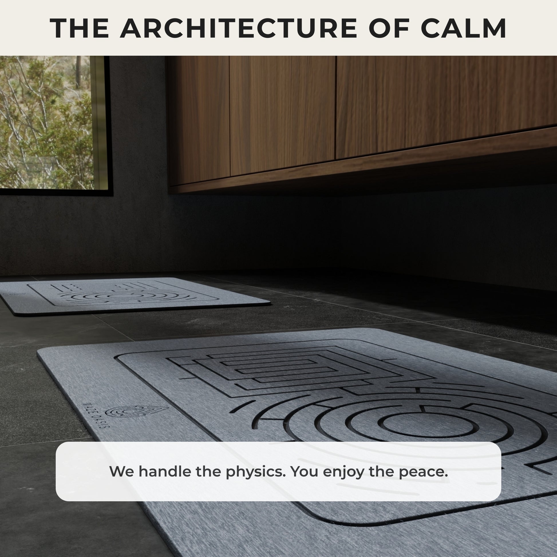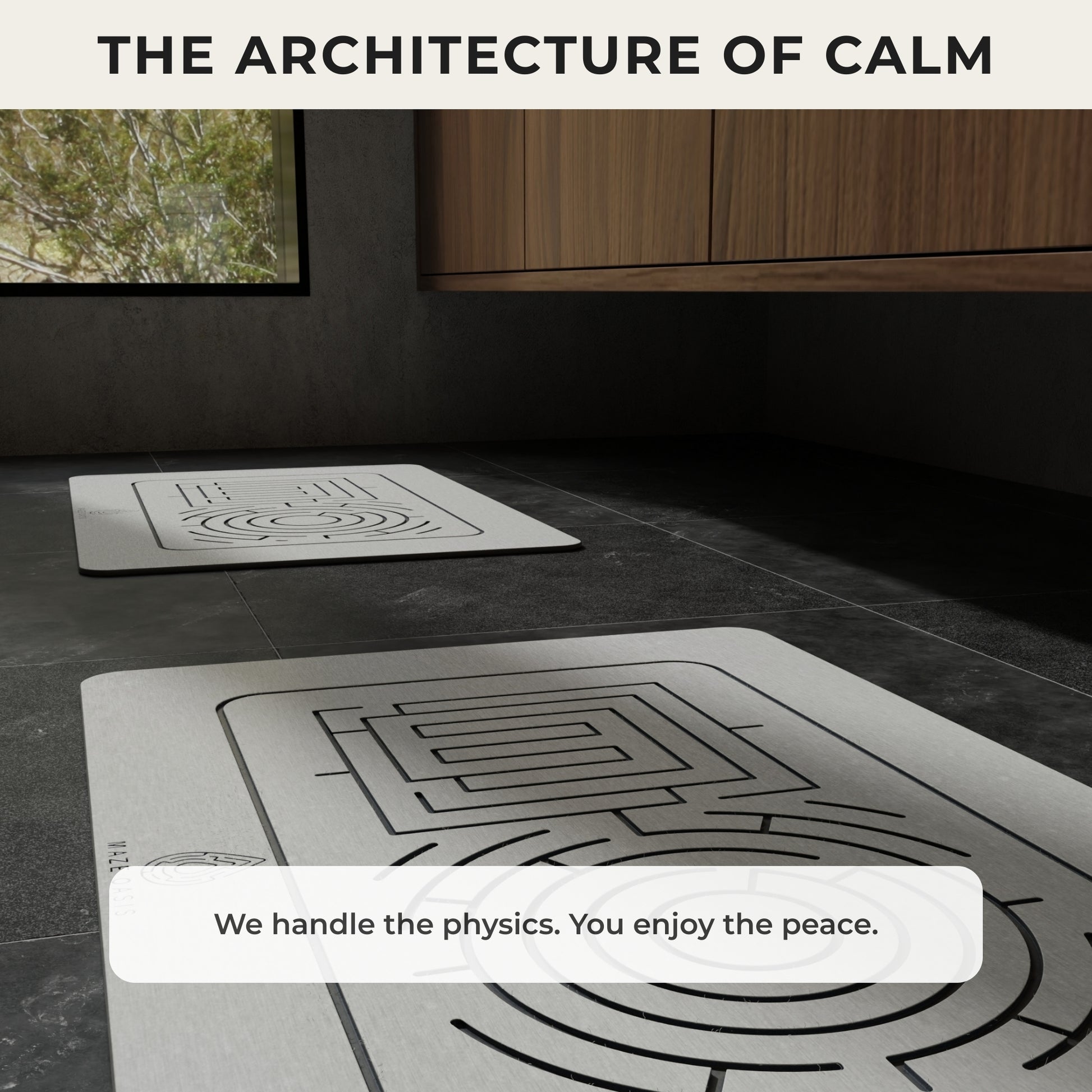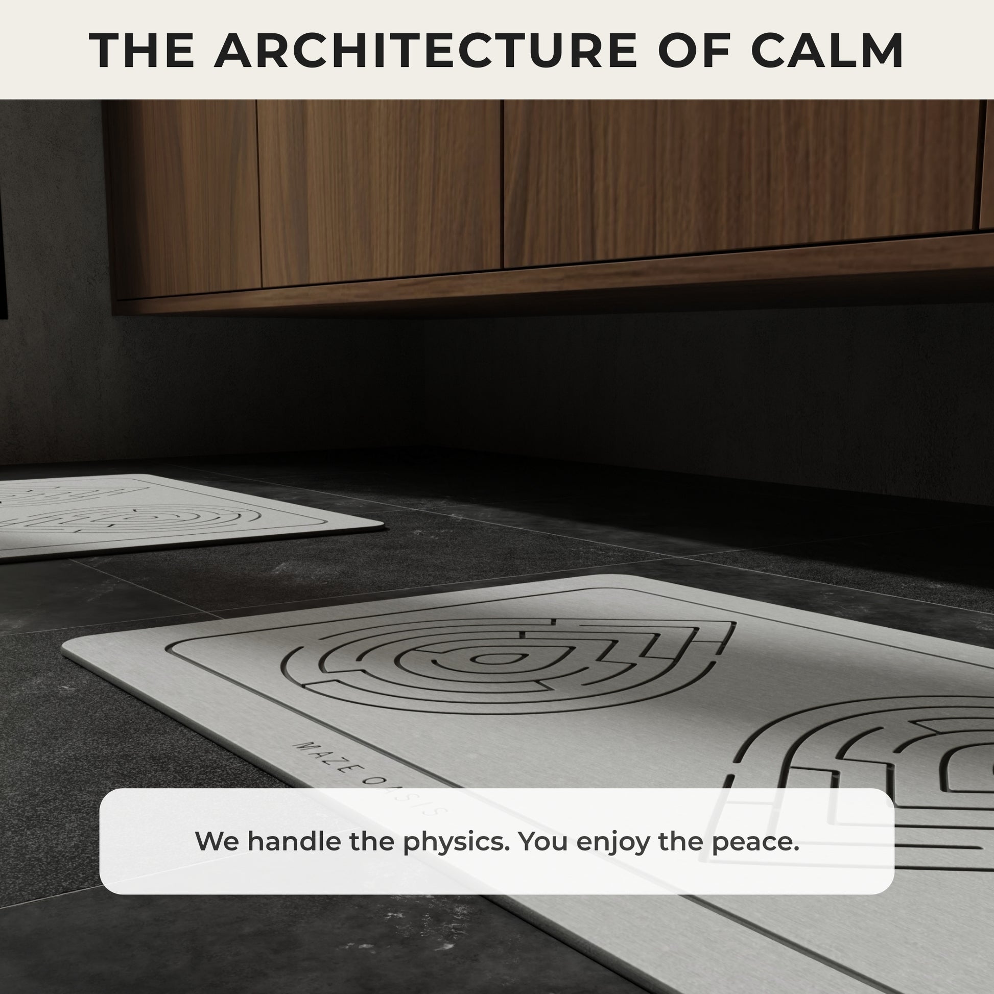 Our maze pattern is the heart of our design philosophy—where art meets function. Aesthetically, it adds a touch of minimalist sophistication. Functionally, the artfully carved channels increase the mat's total surface area, pulling water away from your feet and dramatically accelerating evaporation for the quickest, most complete dry you've ever experienced.