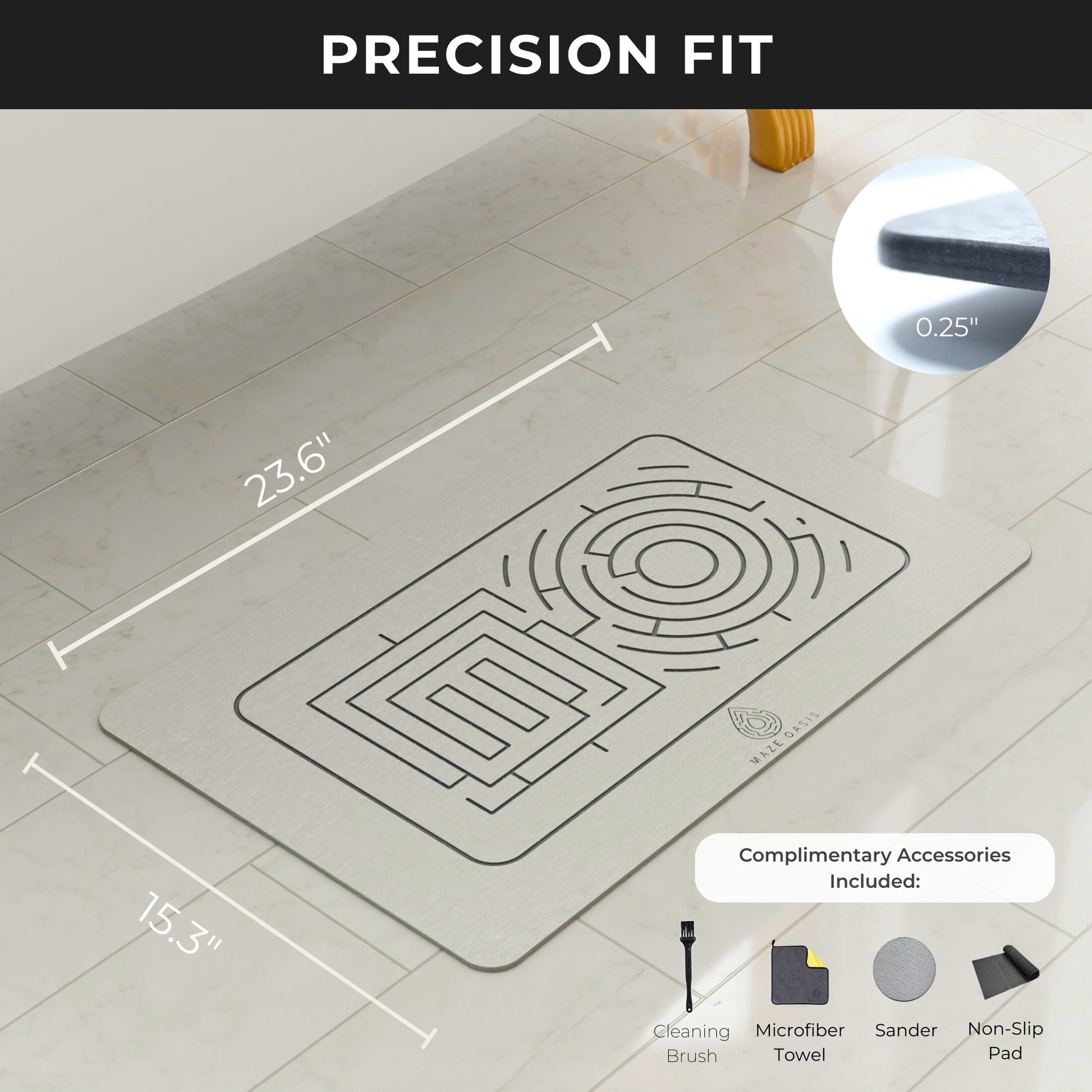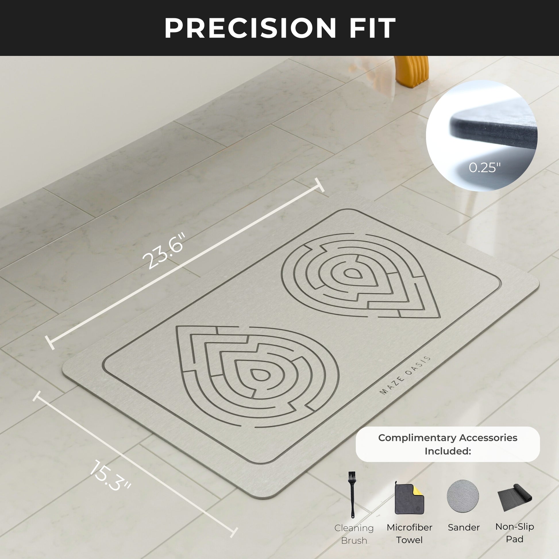 Package Contents: 1x Maze Oasis Stone Bath Mat, 1x Custom-Fit Non-Slip Safety Pad, 1x Surface Refreshing Tool (Sandpaper), 1x High-quality Micro-fibre Towel, 1x Cleaning brush for the nooks of the engraving, and 1x Welcome & Care Guide